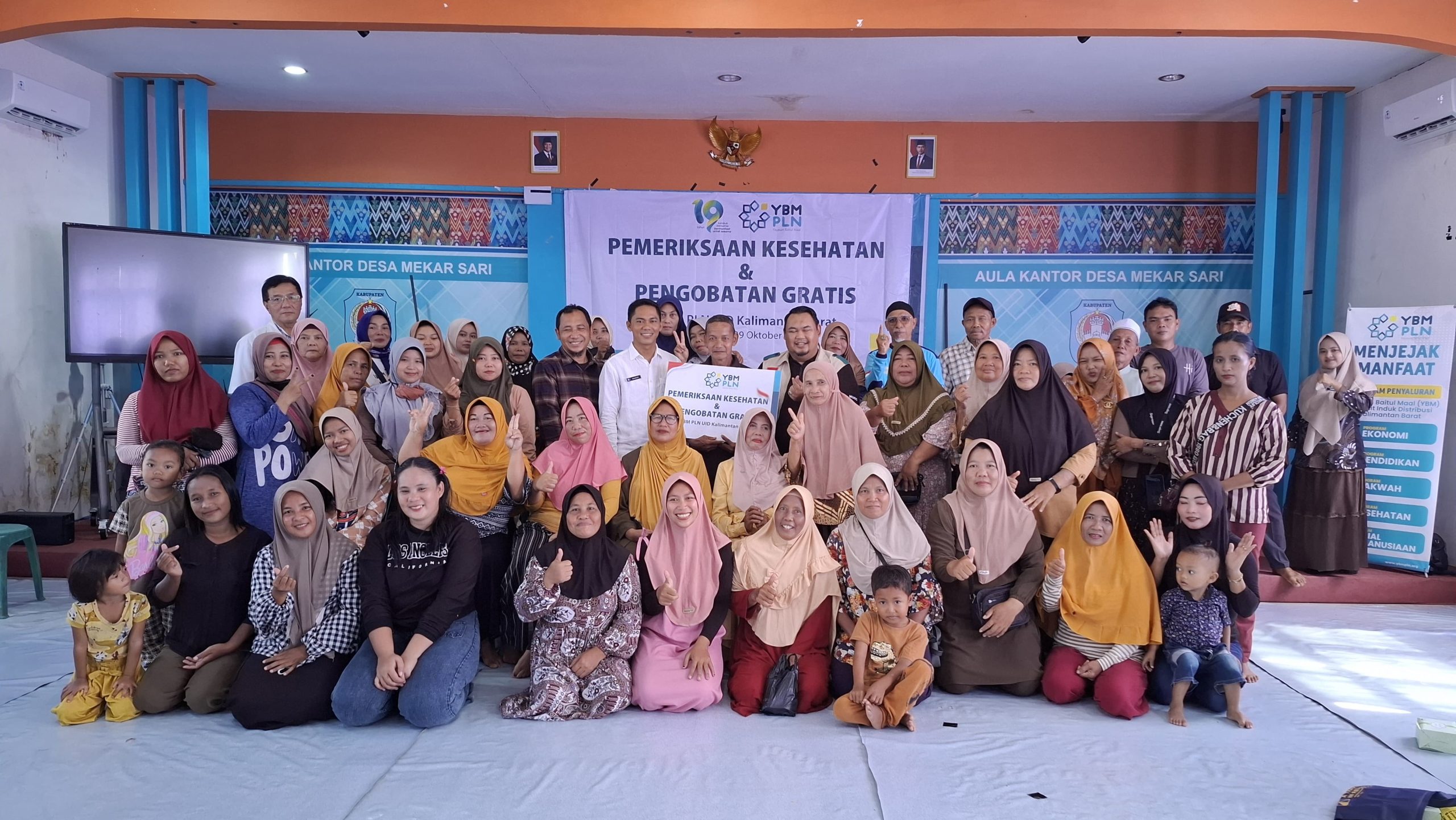 | Ketua YBM PLN UID Kalimantan Barat, Mukhlis Zarkasih, dan Kepala Desa Mekar Sari, berfoto bersama Masyarakat Desa Mekar Sari sesaat sebelum kegiatan pemeriksaan dan pengobatan kesehatan gratis dimulai (FOTO/DOK/PLN) |